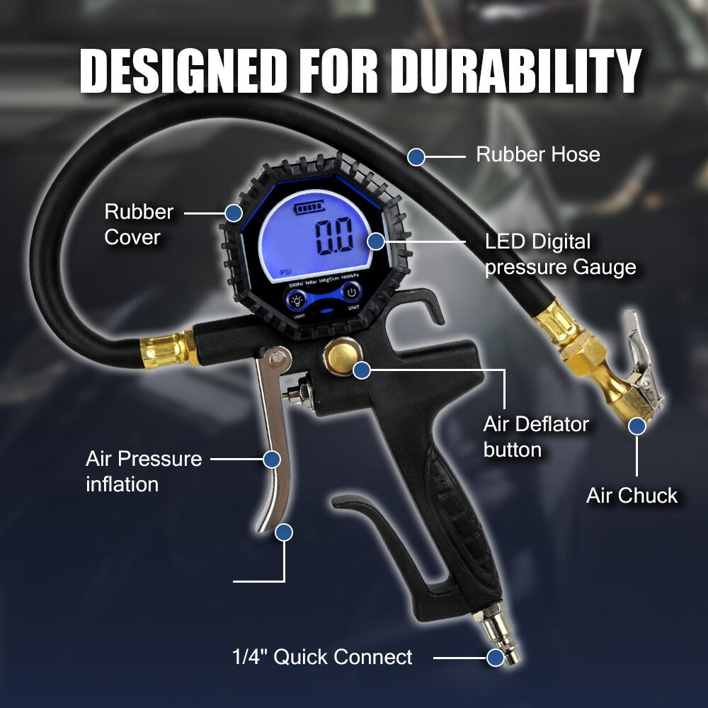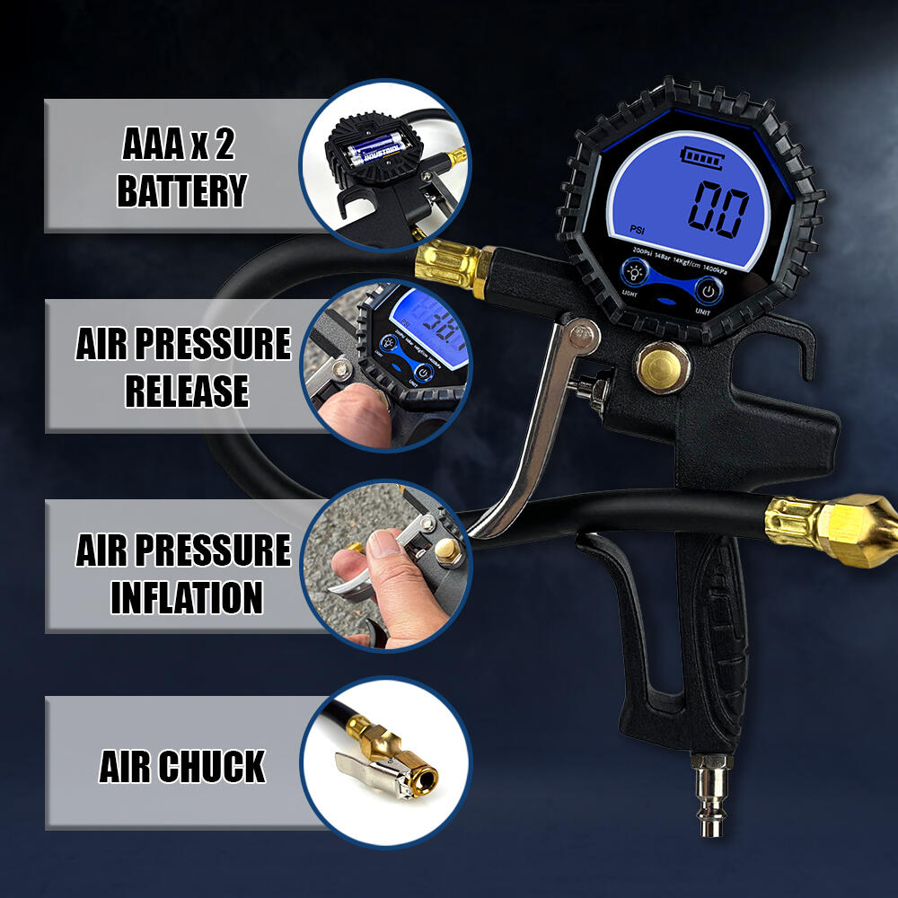 Attach the gauge to the valve stem for instant digital pressure readings or connect to a compressor for quick, accurate inflation up to 200 PSI.